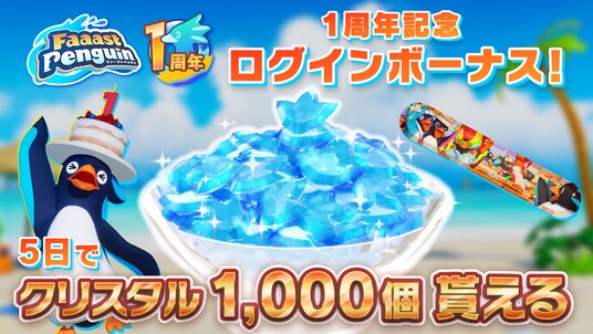 クリスタル1,000個や限定アイテムが貰えるログインボーナスや限定アイテム、セールや復刻などお祝いムード盛りだくさん。この機会にぜひプレイしてね!