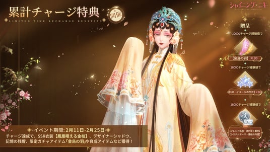 キャンペーン期間中、チャージ達成でSSRセットコーデ「鳳凰咥える金枝」やデザイナーシャドウ、新撮影ポーズを獲得できます。