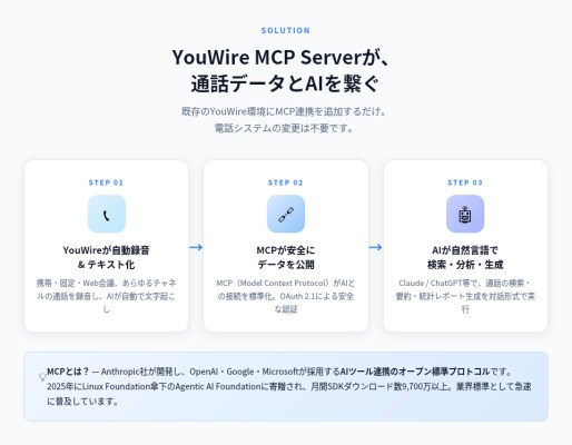 ■ 通話録音データをAIエージェントに安全に接続する「YouWire MCP Server」の提供を開始