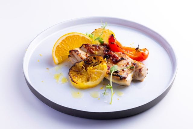 チキンをはっさくの果汁と塩麹のマリネ液に漬け込み、石窯で焼き上げた「はっさく香る、塩麹チキンロースト」。白ワインとのペアリングで、優雅なランチタイムを過ごせそうです。