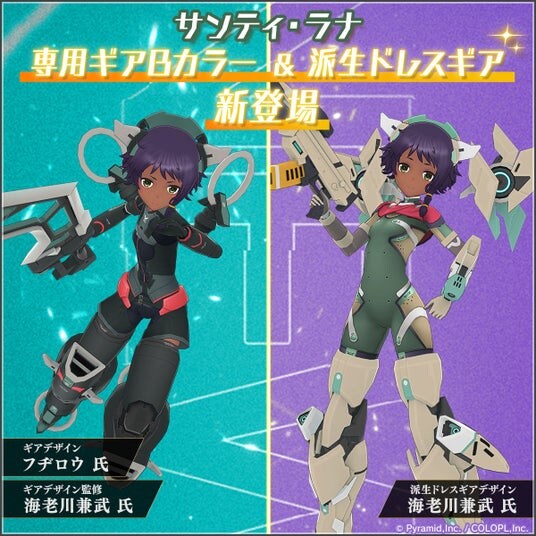 また、専用ギアの派生進化ルートが追加され、海老川兼武氏による新規デザインのドレスギアも登場しています。従来の専用ギアとは異なる効果のスキルが使用可能になっているほか、こちらもカラー変更機能に対応しておりますので、好みのスタイルで任務に挑むことができます。