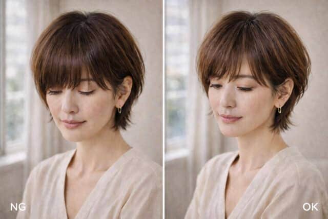 安心感を求めて前髪を厚めに残していると、目元に影ができ、表情がやや沈んで見えがち。特にショートヘアの場合、前髪だけが重いと全体のバランスが詰まり、古い印象につながりやすくなります。