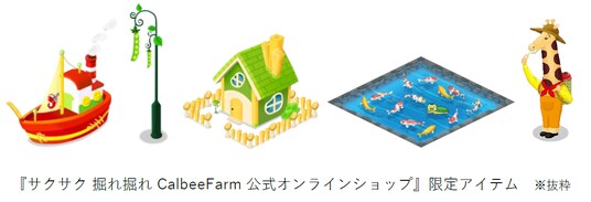 『サクサク 掘れ掘れ CalbeeFarm 公式オンラインショップ』は、『サクサク 掘れ掘れ CalbeeFarm』のゲーム内アイテムが購入できる公式オンラインショップです。通常のプレイでは手に入らない、カルビーの人気おかしをモチーフにした個性的インテリアやキャラクターなどを取り揃えており、本ゲームの楽しみ方がさらに広がります。