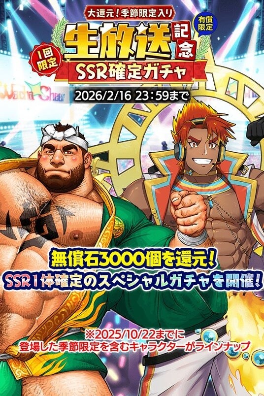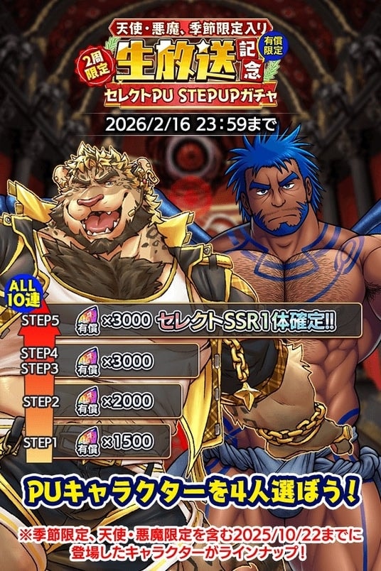 無償原神石3000個の還元に加え、SSR1体確定の『生放送記念 大還元!季節限定入りSSR確定ガチャ』、STEP5の10連ガチャでピックアップしたSSR1体が確定する『生放送記念 天使・悪魔、季節限定入りセレクトPU STEPUPガチャ』などオトクなガチャが開催!