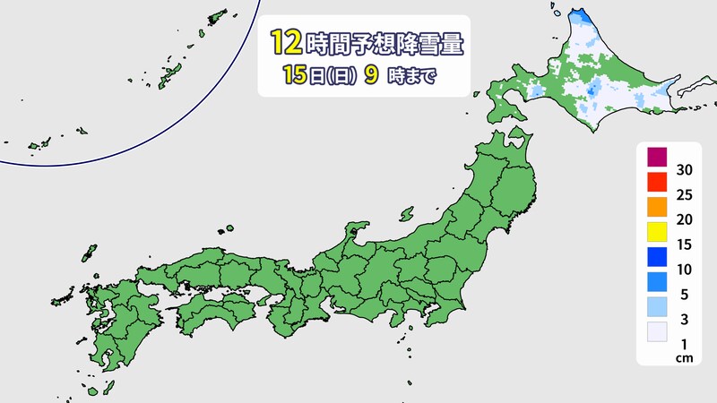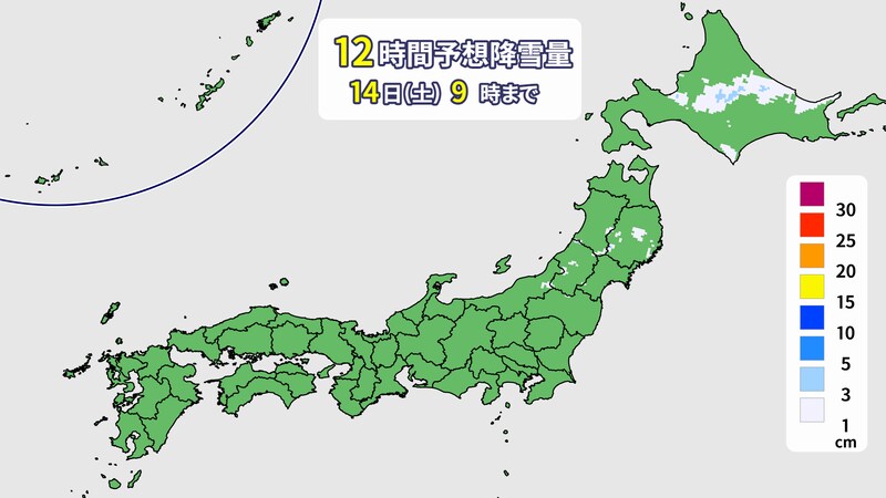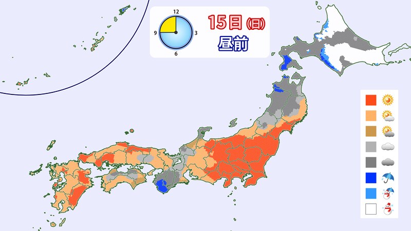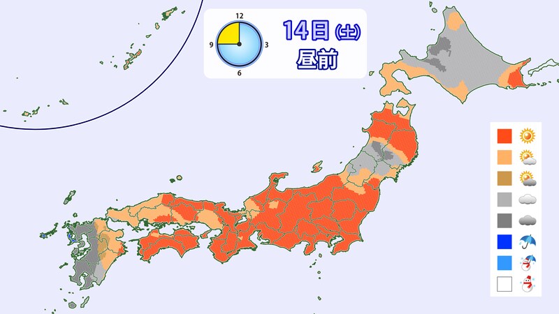 14日(土)から日中も雪は降らないでしょう。15日(日)の午前中は東北南部、蔵王や天元台などは晴れそうです。東北北部や東北南部も午後は次第にくもりとなるでしょう。前日ゆるんだ雪が朝は冷え込みによってアイスバーンとなりそうです。朝イチの滑走は注意。日中は次第に雪が緩む見込みです。