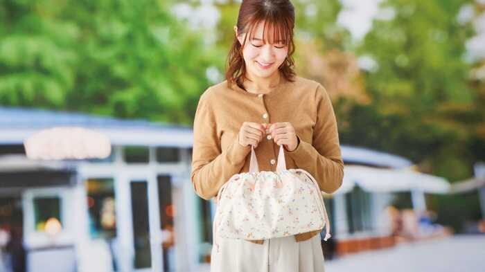 巾着型でマチあり。長財布や500mlペットボトルが収納可能。取り外し可能なショルダーストラップ付き。