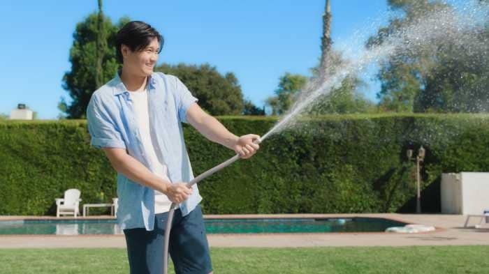 新TV-CM「雪肌精のタフ膜UV」篇では、降り注ぐ日差しの下、サングラス姿の大谷翔平選手が豪快に水を撒く印象的なシーンからスタート。