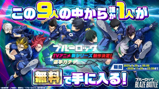 「ブルーロック」TVアニメ新シリーズ制作決定を記念して、“青い監獄”11傑所属の★3選手を必ず1体獲得できるキャンペーンを開催中です。