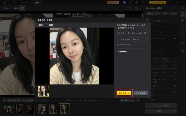 手順3:仕上げた写真を「エクスポート」で保存し、出力先と画質を選ぶだけで完了です。