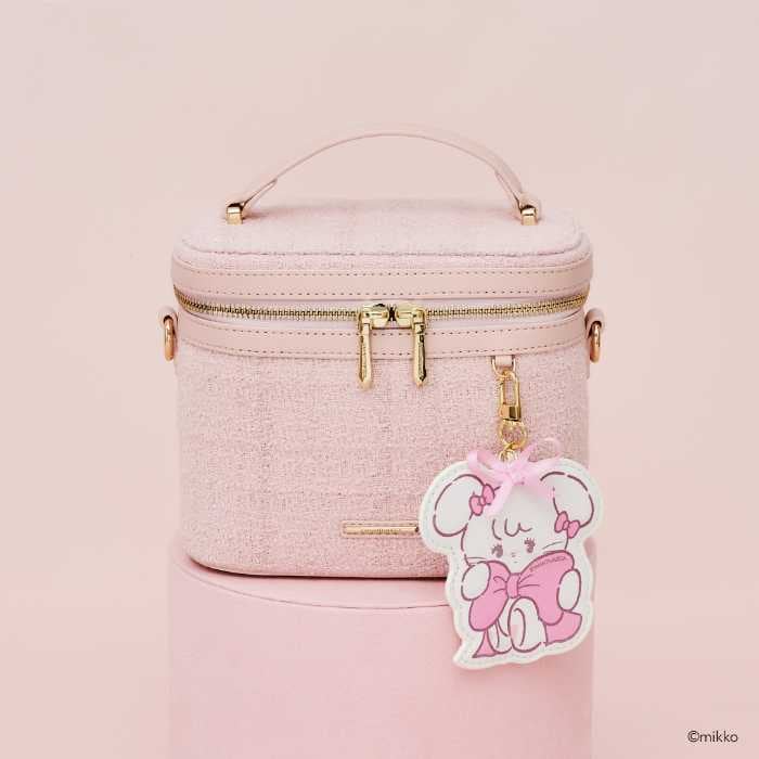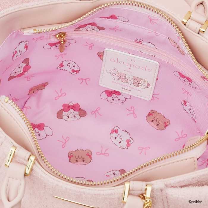 キラキラ生地とミラーチャームがポイント。ショルダー付き2WAY仕様で、裏地はキャラクターとリボンの総柄デザイン。