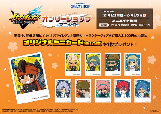 期間中、開催店舗にて『イナズマイレブン』関連のキャラクターグッズをご購入2,200円(税込)毎に「オリジナルミニカード(全10種)」を1枚プレゼント!