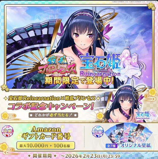 合同会社EXNOA(本社:東京都港区、CEO:東條 寛、URL:https://games.dmm.com/)が運営するDMM GAMESにおいて、2026年2月13日(金)より 3D放置RPG『宝石姫Reincarnation』にて、『戦乱プリンセス』とのコラボイベントを開始しました。