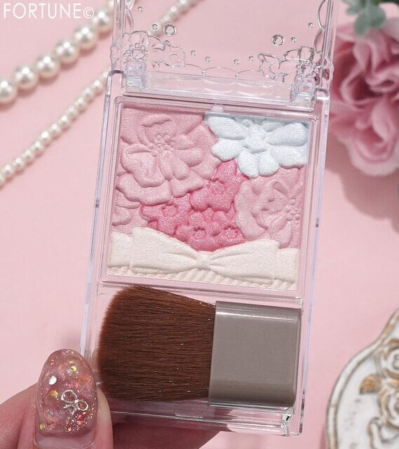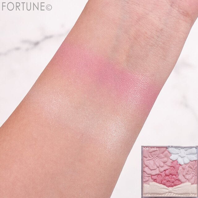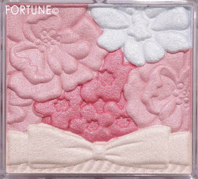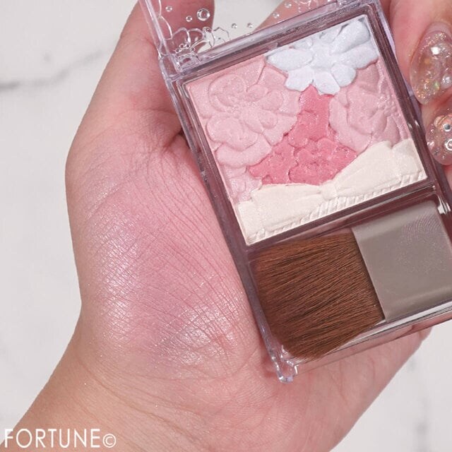 仕上げに、ツヤを足したい部分へグロウパウダー(パレット下側/リボンデザインの部分)をのせるだけで、立体感のある頬が完成します。