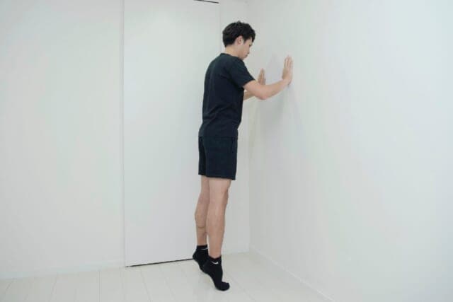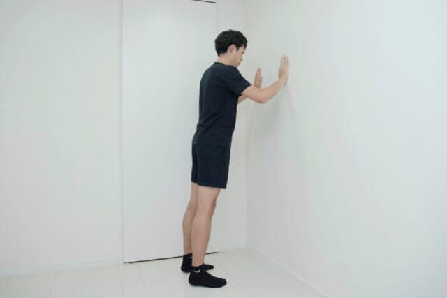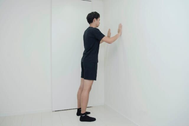 (1)両脚を肩幅に開き、両手をぴったりと壁につけ、やや前傾姿勢になる