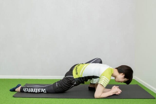 (3)左ひじも床につけて10秒間キープする