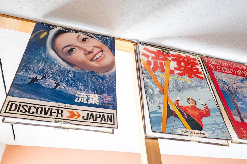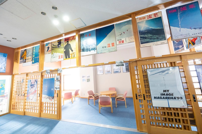 スキー場のベースにある「Mプラザ」は、スキー場の顔であると同時に地域の交流センターでもある。通年利用され、世代も目的も異なる人々が集う場所。施設の25周年記念展示として、どれも懐かしさを感じるレトロなデザインの歴代のポスターが並ぶ。