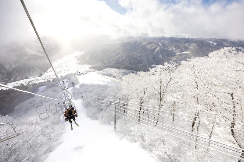 足慣らしを済ませ、ペアリフトで山頂へ向かう。岐阜県内でもとくに美しい樹氷が見られるとの評判通り、リフト乗車中はもちろん、ゲレンデのあちらこちらで、樹氷した木々が光を受けてキラキラと輝いていた。
