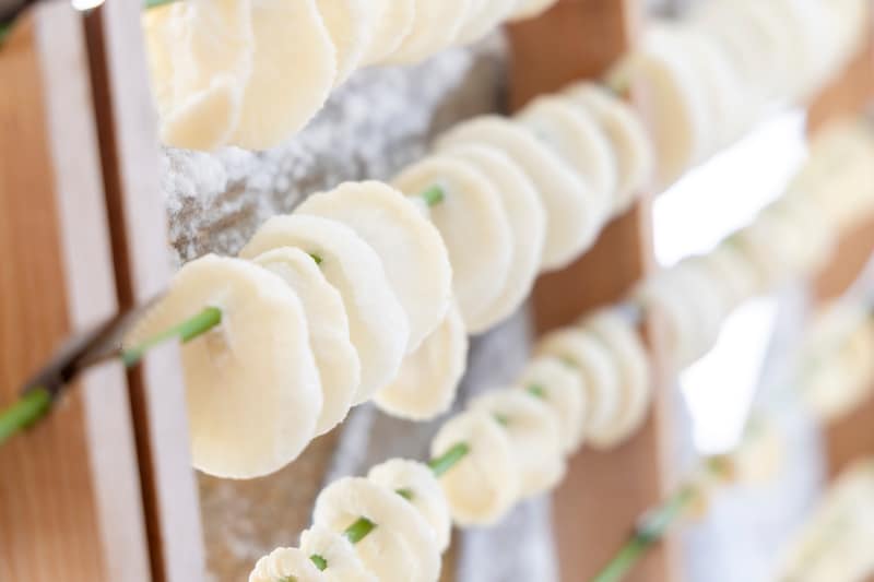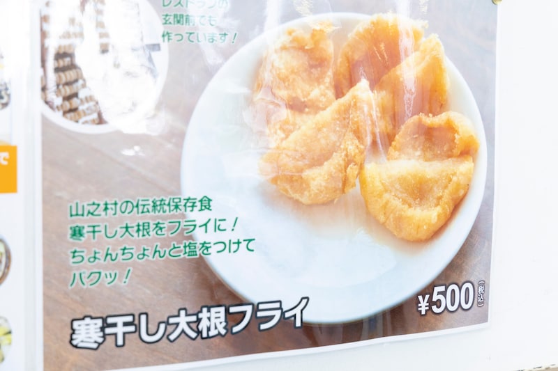 なかでもユニークなのが、伝統食材「寒干し大根」を使った一品。寒さを利用して1ヵ月ほど乾燥させた大根を揚げ、塩をつけていただく「寒干し大根フライ」は、ここでしか味わえない食感と甘みだ。
