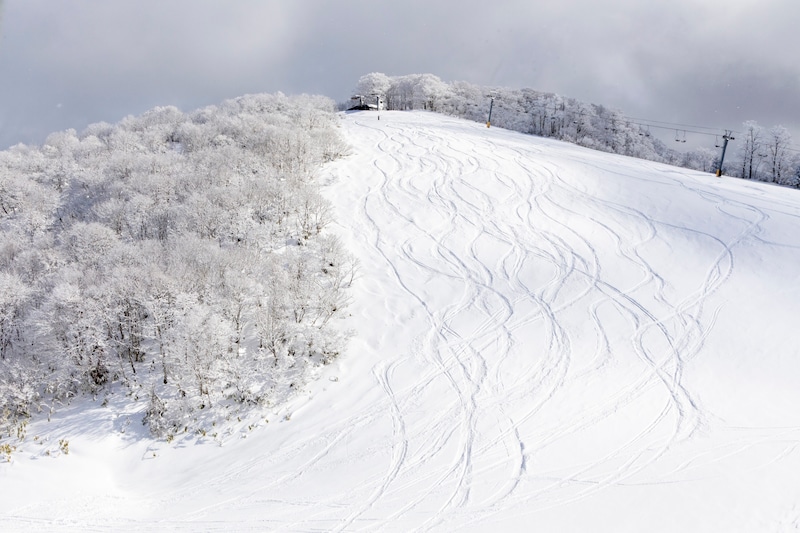 無欲の勝利か。スキー教室の子どもたちが、意図せずパウダー争奪戦に勝ってしまう。パウダーの上を、列をなして優雅にトレインしていく。そんな光景は珍しくなく、午後になっても手つかずの斜面が残っている。慌てることなく、急かされることもなく、極上のパウダーを味わえる。この“余白”こそが、ひだ流葉最大の贅沢かもしれない。