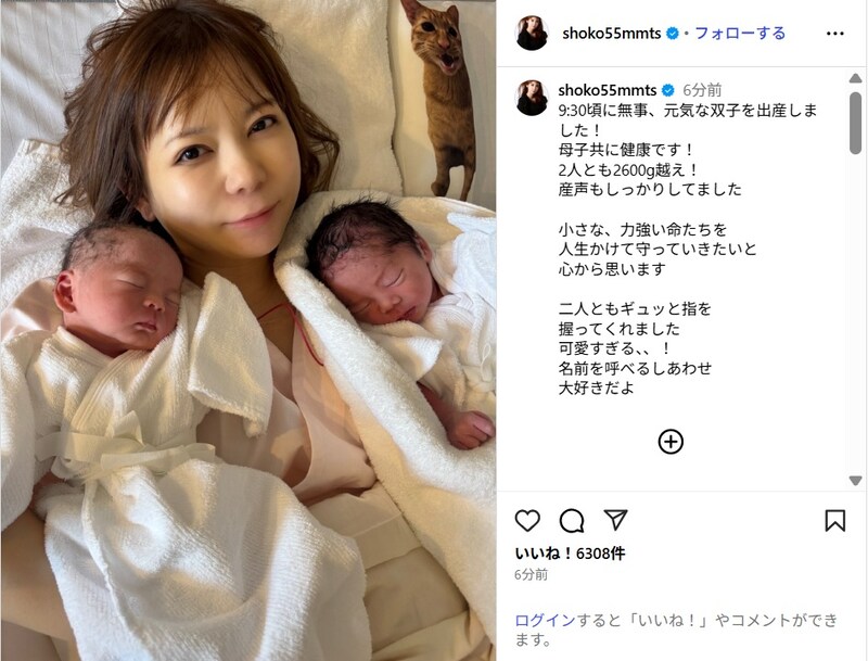 この投稿にファンからは、「しょこたんおめでとうございます」「双子ちゃんめちゃくちゃ可愛いですね」「母子ともに無事に出産できて良かったです」「ゆっくり休んでくださいね」「双子ちゃんの健やかな成長をお祈りしています」などのコメントが寄せられている。
