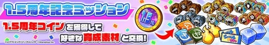 期間限定の「1.5周年記念ミッション」をクリアし、「1.5周年コイン」を集めて、「1.5周年コイン交換所」で、「S4」などのブーストアイテムや、「アイテムボックス」など好きな育成素材と交換する内容となっております。