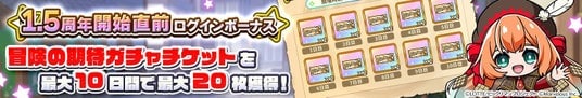 本メンテナンス後より、ログインした際に「冒険の期待ガチャチケット」を2枚、最大10日間で20枚獲得(最大20連分)できる特別なログインボーナスを開始いたしました。