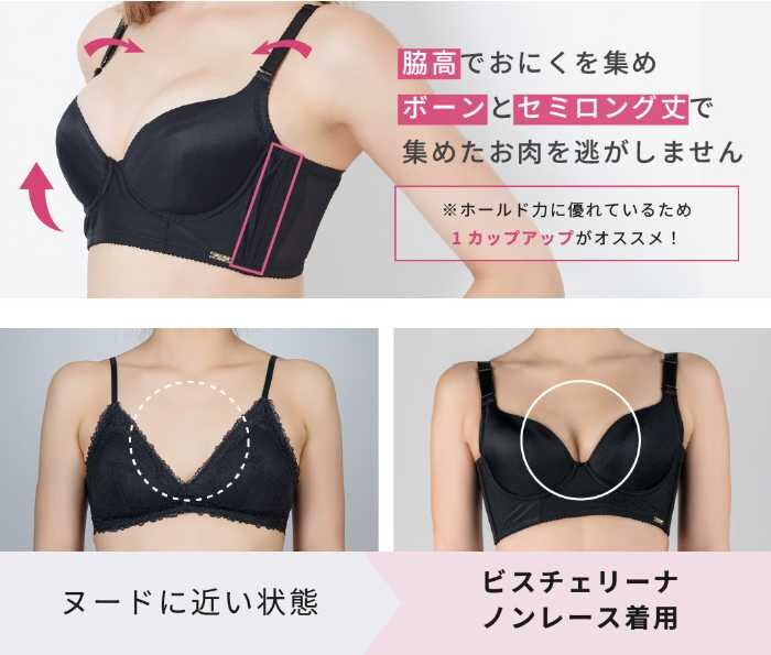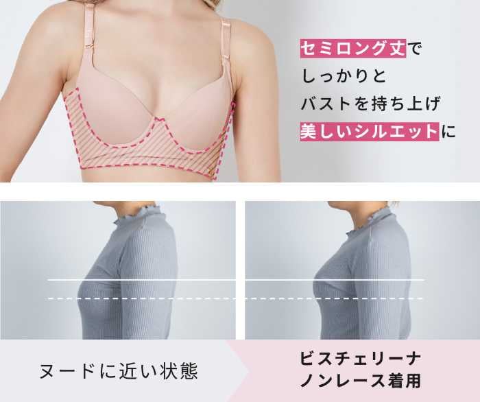 「ビスチェリーナ ノンレース」は、ビスチェのようなセミロング丈が最大の特長。トップとアンダーにしっかり差をつけ、自然なくびれ感と立体的なバストラインを演出します。