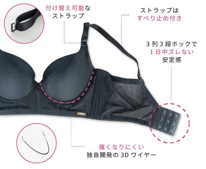 独自開発の3Dワイヤーは体のカーブに沿いやすく、痛くなりにくいのも魅力。3列3段ホックで安定感を高め、ストラップはすべり止め付きでずれにくく、付け替えも可能。