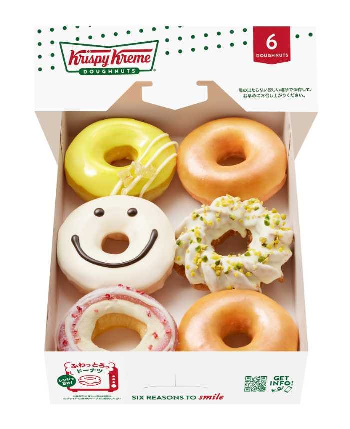 ピスタチオ ホワイト チョコ クルーラー、Kome-Dough いちごミルク、スプリング レモネード、ホワイト スマイル、オリジナル・グレーズド®を詰め合わせた6個入り。