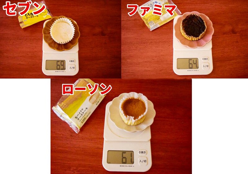カップを含めたチーズケーキの総重量を測定したところ、最も重いのはセブン-イレブンの69g、次いでファミリーマートの64g、ローソンの61gでした。僅差ではありますが、セブン-イレブンがわずかに重量でリードしています。