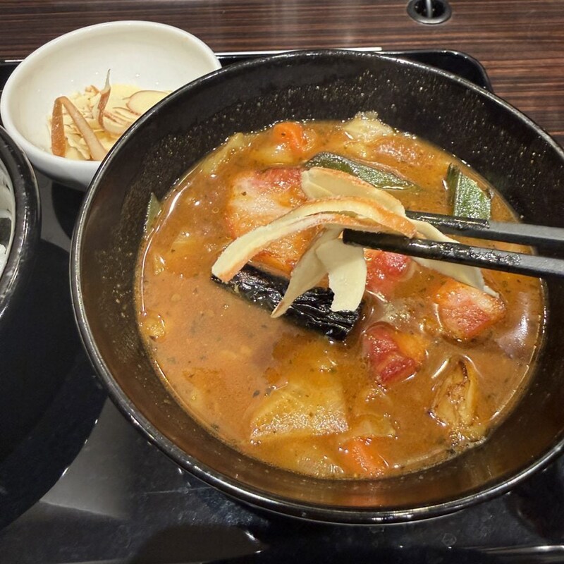 心地よい歯ごたえの肉塊、スモークチーズと絡むと、なんともリッチな感じに。スープカレーとしてしっかりまとまっており、満足できるのではないだろうか。