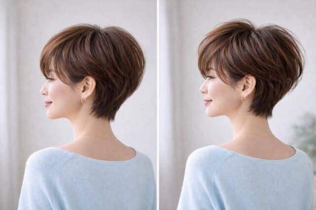 ショートヘアは、わずかな高さの違いがそのまま印象に直結します。トップが平坦だと視線が横や下に流れやすくなり、フェイスラインが強調されて見えることも。