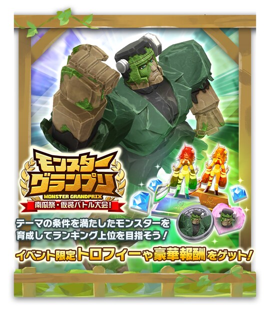 「モンスターグランプリ『南瓜祭・仮装バトル大会!』」を開催します。前半、後半で3つずつ用意されたテーマに沿ってモンスターを育成完了し、「いいね(総合力を元にしたポイント)」でランキングを競います。月の前半、後半を合算した総合ランキングにより獲得できる専用トロフィーには総合ランキングの順位が保存され、いつでも確認することができます。イベントの詳細はゲーム内にてご確認ください。