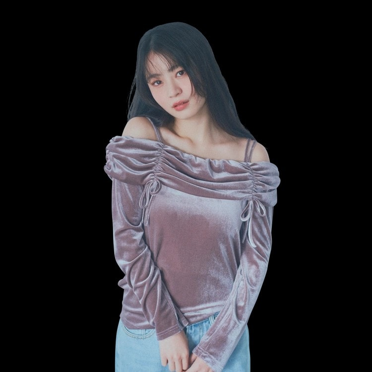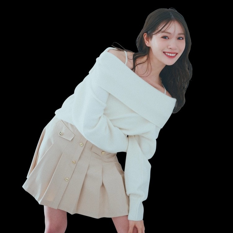 鎖骨から肩にかけてを肌見せするからこそ、胸元のシルエットは控えめに。清潔感のある白がピュアな雰囲気をつくってくれる◎。