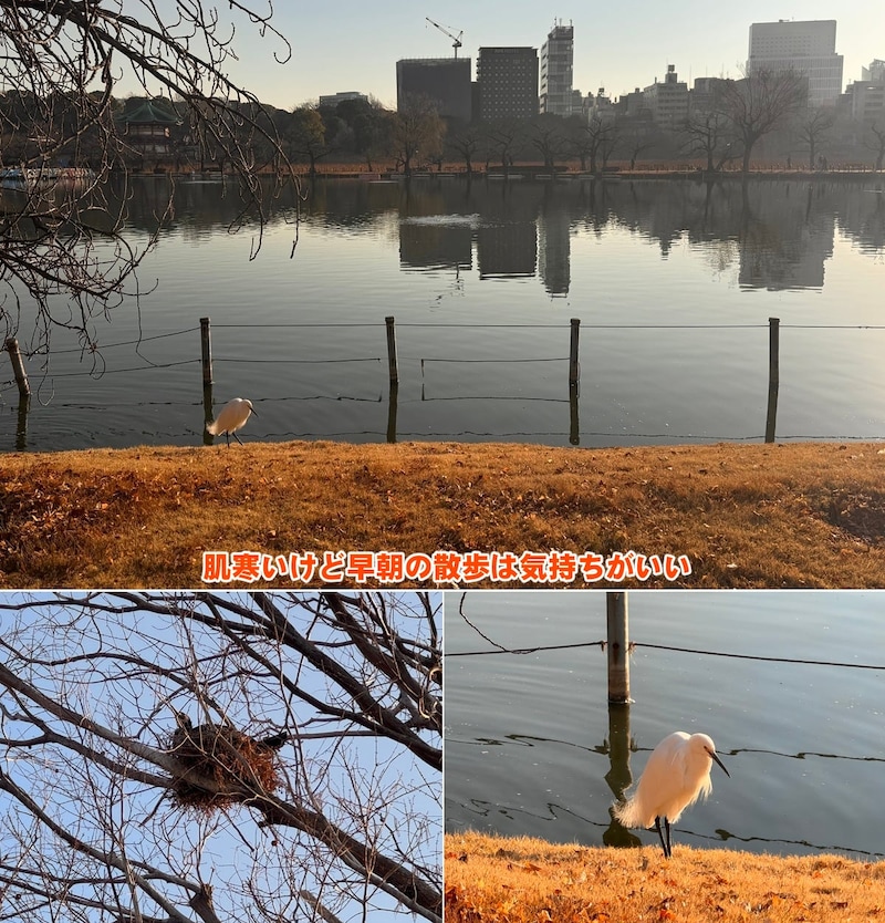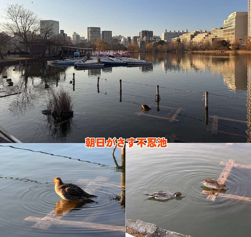 不忍池に集まる鳥たちも、朝日を浴びながら巣作りや毛づくろいをする様子を眺めつつ、こちらもせっせとキンギョソウのエキスを回収。