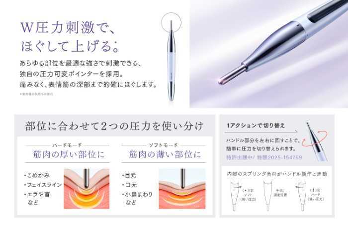 従来の“ポスポス”美顔器に多かった「効くけれど痛い」「部位によっては刺激が強すぎる」といった課題に着目し、筋肉の厚みに合わせて圧力を調整できる圧力可変™設計を採用。