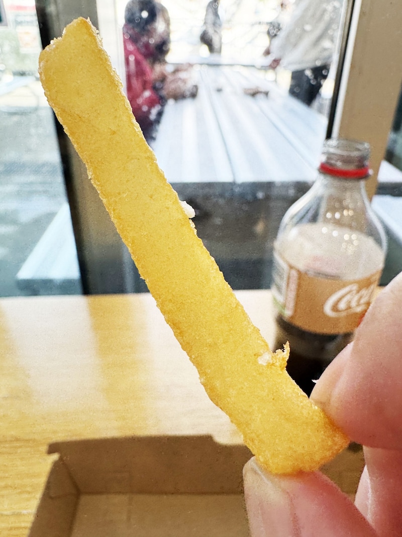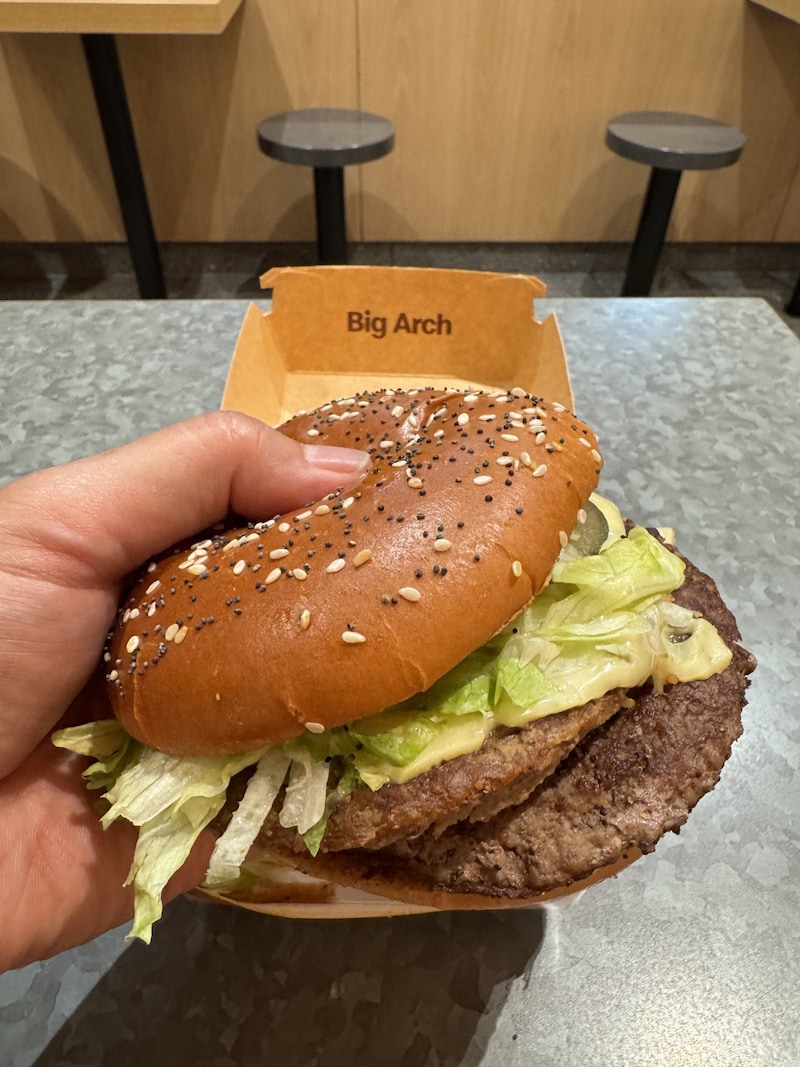 ちなみにバンズはポピーシードを使用したビッグアーチだけの特注品。ビッグアーチは、ポピーシードのバンズ、ビーフパティ2枚、チーズ3枚、レタスとピクルスどっさりな構成。食べてみると……。予想外にクリーミィー! ソースがまろやかなだけでなく、チーズが3枚もサンドされているから濃いのですね! ちなみにビッグマックソースではなく、ビッグアーチソースが使われています。それが本当に濃い酸味とコクを楽しませてくれるのです。そんな濃いテイストが延々と続くのですよ。デカいから!! 最高です。