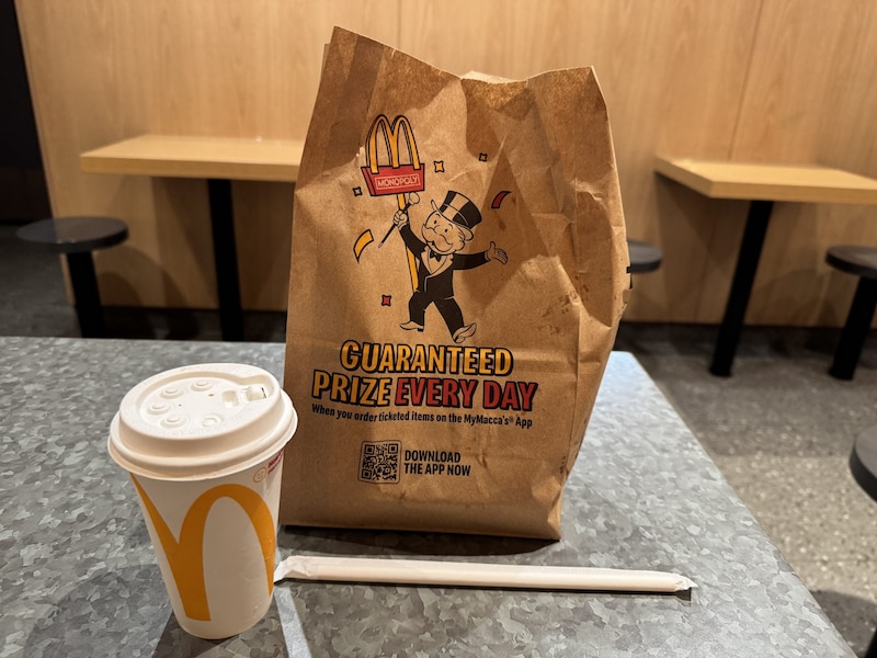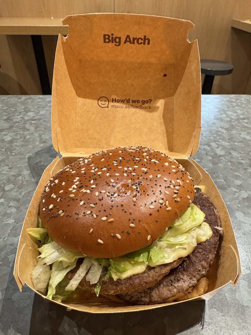 ビッグアーチとマックフライポテトSとコカ・コーラゼロSのセットを購入し、価格は17.50AUD(約1750円)でした。パッケージがビッグアーチのオリジナルデザイン! しっかりと、ビッグアーチの特徴をとらえたデザインになっていました。むっちゃデカい。あまりにもデカすぎて、バンズからパティがはみ出しています。そもそもバンズも巨大に見えるのですが気のせいでしょうか。