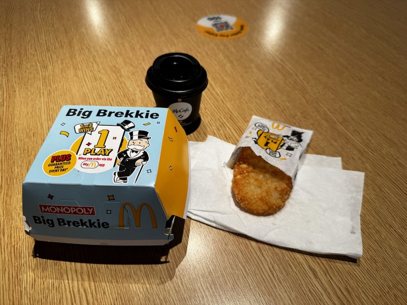 熱によりしっかりと抱擁するようにハッシュポテトに染み込んだチーズは、食べる前から「これ絶対ウマイやつ」と思わせるヤバめなやつ。ビッグブレッキーバーガー単体でも濃いキャラクターをしているのですが、朝マックとしてハッシュポテトがもう一枚ついてくるのです。つまり「ハッシュポテトのバーガーをハッシュポテトと共に食べる」ということです。
