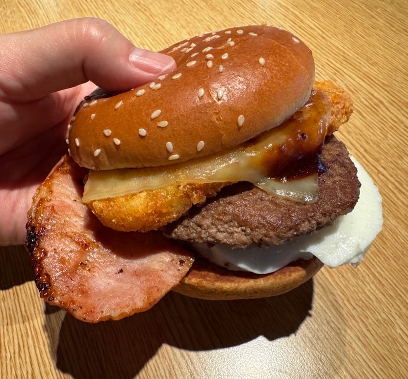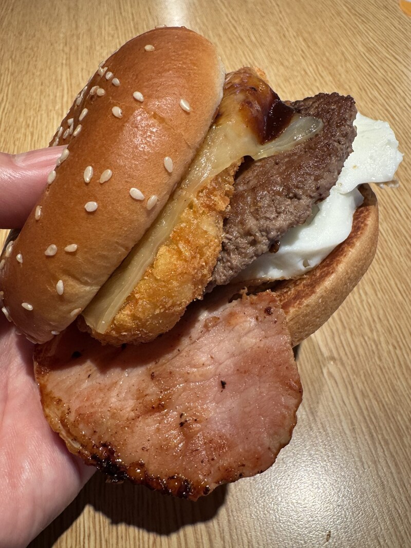 ビッグブレッキーバーガーは、チーズ、ハッシュポテト、目玉焼き、ベーコン、ビーフパティ2枚がサンドされた超絶大ボリュームな朝マックグルメ。はみ出すほど巨大な具の数々。このビッグブレッキーバーガーの自己主張の強さには凄まじいものがありますが、特に食欲をそそらせるのが、とろけるチーズが染み込んだハッシュポテトです。