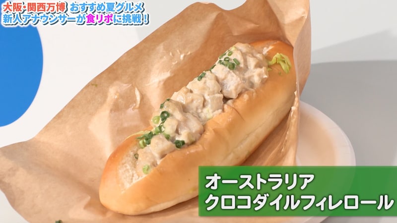 藤岡アナが挑戦したのは、オーストラリアパビリオンのレストランで味わえる「クロコダイルフィレロール」(1,650円)。ワニの肉を使ったロールサンドです。