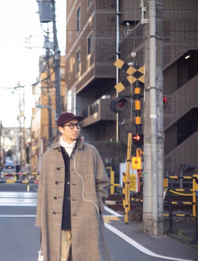 コーデュロイ素材のキャップ9900円/ビームス プラス(ビームス プラス 原宿TEL03-3746-5851)、クラウンパントのメガネ4万2900円/アイヴァン(アイヴァン 東京ギャラリー TEL03-6450-5300)、バルマカーンコート24万2000円/アナトミカ(アナトミカ 東京TEL070-3144-0378)、CPOシャツ5万2800円/D.C.ホワイトTEL03-6447-5095、チノパンツ2万9700円/ヤンクシャー(アール 柳橋TEL080-7024-4090)、トートバッグ4万700円/ウティ(にしのやTEL03-6434-0983)、タートルネックTシャツはスタイリスト私物