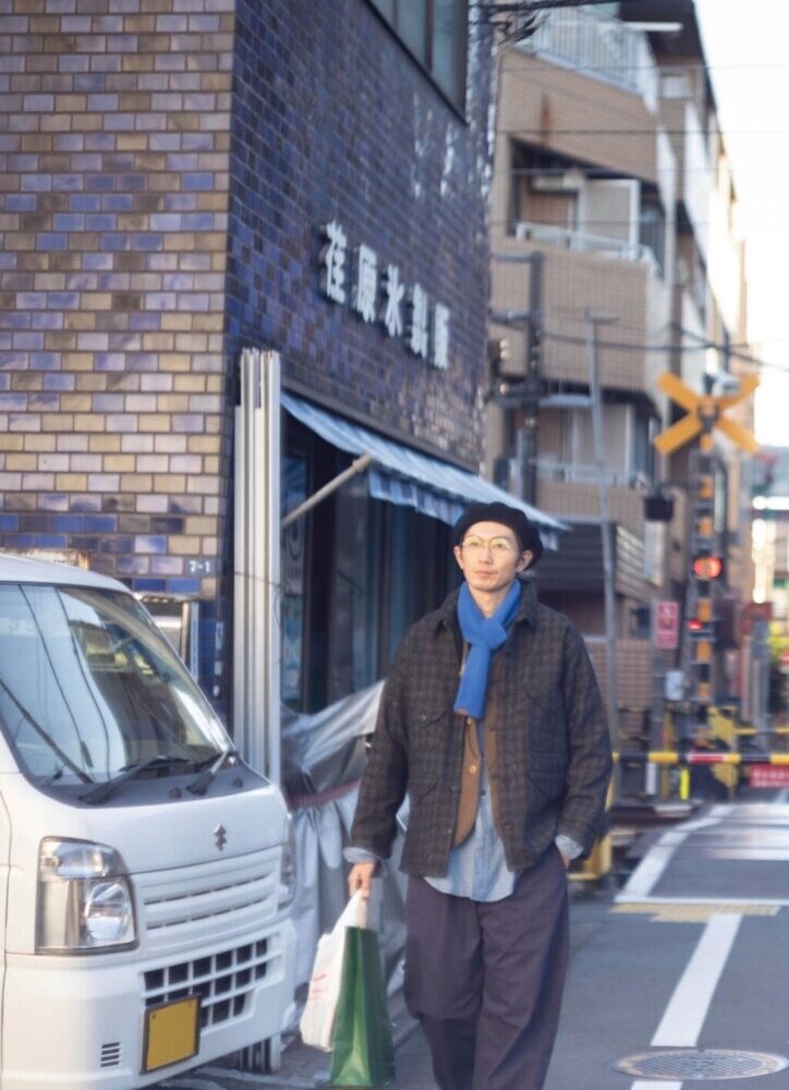 ベレー/ボルサリーノ1万8700円(中央帽子TEL03-5839-2098)、ラウンドのメガネ3万9600円/ディグナクラシック(ディグナハウスTEL03-5843-1612)、ジャケット8万8000円、ベスト6万6000円/ともにポストオーバーオールズ(ポストオーバーオールズ中目黒TEL03-6303-2160)、シャンブレーシャツ3万3000円/ビッグヤンク(アール 柳橋TEL080-7024-4090)、パンツ3万8500円/グランク(にしのやTEL03-6434-0983)、カシミヤ素材のマフラー9900円/インフィールダーデザイン(タマニワTEL0-6427-7685)