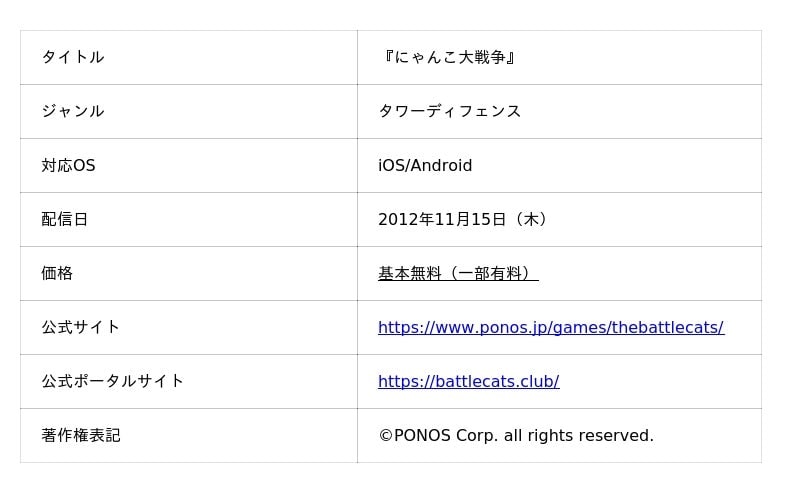『にゃんこ大戦争』は、iOS・Android向けタワーディフェンスゲームです。プレイヤーは様々な能力を持つ「にゃんこ」たちを編成して、各地を侵略していきます。2012年のリリース以来、個性的なキャラクターや独特の世界観が、日本のみならず世界中の多くのお客様にご支持をいただいています。今後も多様なメディア展開やコラボレーションを積極的に行ってまいります。