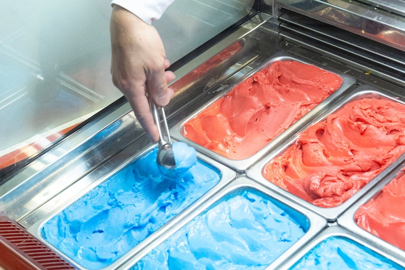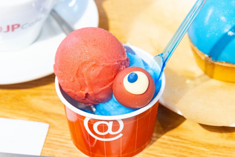 メニューは「ミャクミャクジェラート(ダブル)」(1,100円)。赤と青のミャクミャクカラーが目を引くかわいさです。