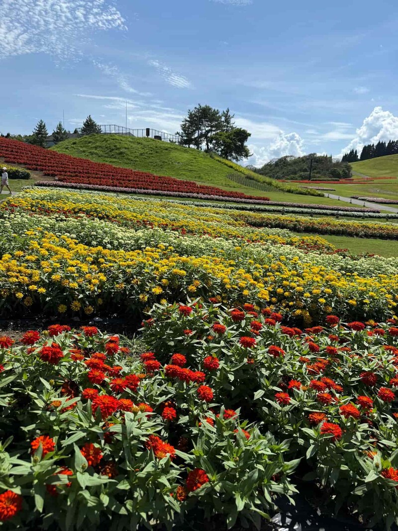 コキアだけでなく、ベゴニア、ジニア、マリーゴールドの花畑にも注目。また、高さ約2mの立体フラワーアートや、天空へと続く階段「ステアーズフラワー」が設置されており、写真映えも抜群です!