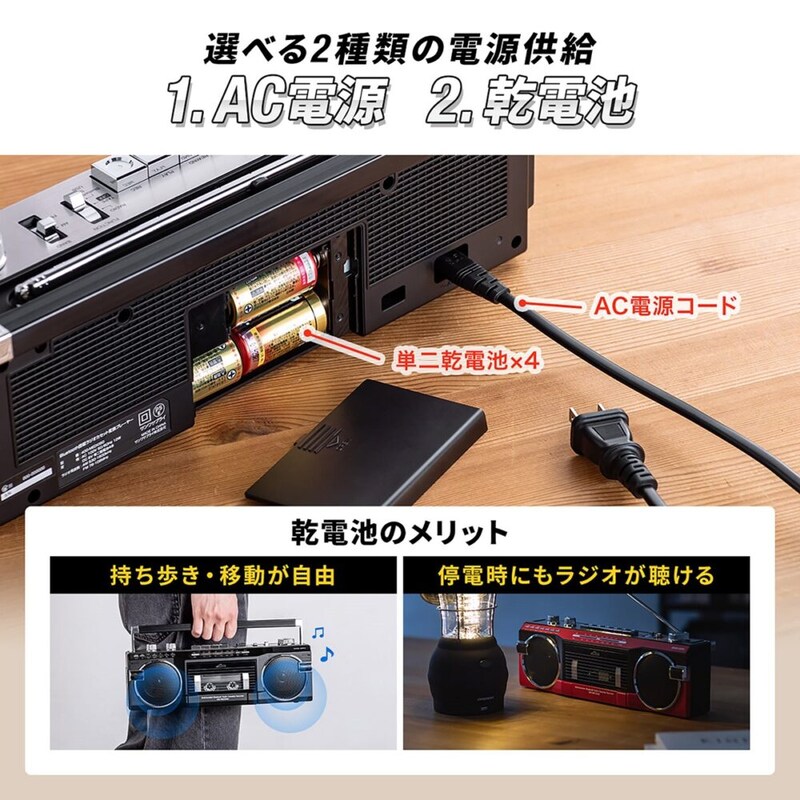 AC電源と単二乾電池×4本の両対応で、屋内外問わず使用可能。取っ手付きで持ち運びやすく、左右合計6Wのステレオスピーカーがしっかりとした音量と広がりのあるサウンドを実現する。技適マーク取得済みで、安心して使用できる。