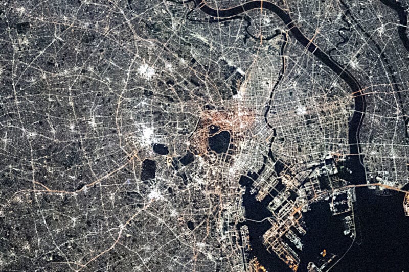街明かりの明るさに対して、皇居や新宿御苑などはとても暗くなっています。また海や河川も暗く映り、東京湾には船の明かりのほか海ほたるも見えています。