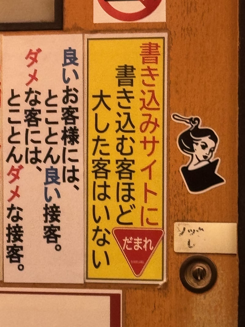 入店できたとしても、まだ厳しいルールは存在する。少なくともお酒を3杯飲む必要があり、ちょい飲みは不可能。しかも1人3杯のオーダーが必須であり、お酒をシェアすることは禁止されている。そのほかのルールやお店の方針は以下のとおりである。