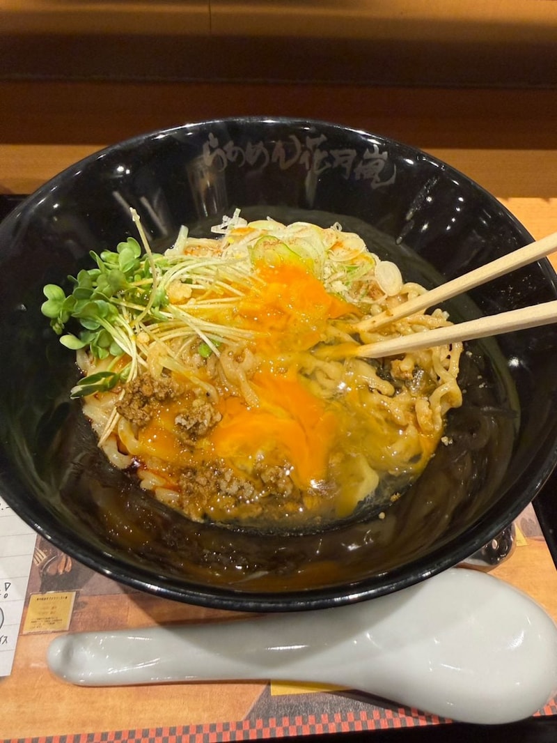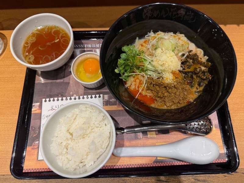 魯珈の人気商品「魯珈プレート」を意識したという花月嵐版の「ロカプレート」で。汁なし坦々麺に生卵、ミニライス、ミニスープがついてくる。